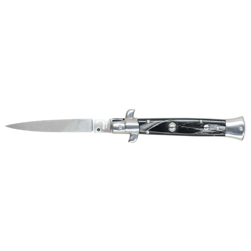 Le couteau automatique Consorzio Coltellinai Auto Stilleto avec manche en plaquettes façon corne dans sa plus petite version, ou plus petit format si vous prĂ©fĂ©rez. En effet, sa lame en acier inoxydable 440 Ă bout pointu (profil spear point) ne mesure que 85mm de longueur. Une petite lame tranchante ainsi que rĂ©sistante Ă la corrosion, sur laquelle il sera possible d’inscrire le texte de son choix (voir bouton ajouter une gravure ci-dessous). Il faut souligner la vitesse de dĂ©ploiement ultra rapide de la lame grâce au mĂ©canisme automatique. Soyez prĂŞts Ă affronter tous les dangers, d’autant plus que ce modèle Auto Stilleto B250-20 signé Consorzio Coltellinai (marque Italienne) est très transportable. Difficile de rĂ©sister Ă l’Ă©lĂ©gance du manche synthĂ©tique avec habillage façon corne sombre, avec un coloris qui contraste parfaitement avec le gris des mitres. Ce couteau automatique vous apportera l’efficacitĂ©, la transportabilitĂ© et l’Ă©lĂ©gance dont vous avez besoin, et tout ça pour un tarif relativement abordable.