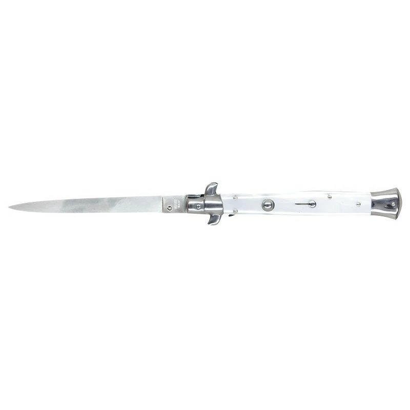 Cet Auto Stilleto de chez Consorzio Coltellinai est un couteau automatique pliant portant la référence B250-28PL. Conçu et fabriqué à Maniago en Italie, ce modèle offre d’excellentes prestations, et tout cela pour un tarif relativement abordable. Ce que l’on apprécie, c’est déjà le joli manche en plaquettes façon perle, un coloris blanc subtil qui se marie très bien avec la couleur grise des mitres. En plus d’un design attrayant, le manche assure aussi une prise en main toujours très confortable ainsi qu’un transport relativement aisé (longueur de 155mm en position fermée, poids de 122g). Ce couteau automatique Auto Stilleto Consorzio Coltellinai manche façon perle est également muni d’une lame spear point de longueur 12cm en acier inoxydable 440. Une lame tout en longueur, qui se veut tranchante ainsi que résistante à la corrosion ou rouille si vous préférez. Difficile de résister à son sublime manche coloris nacre ! Possibilité de graver la lame (voir bouton ci-dessous).