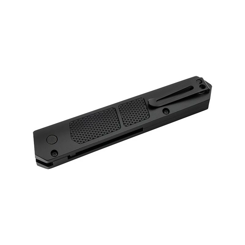 Le manche du couteau automatique est ici fait d’aluminium léger noir, à la texture antidérapante favorisant la prise en main. D’une longueur d’environ 12cm, il intègre un trou de lanière dissimulé ainsi qu’un clip réversible. Livré avec son étui en nylon de haute qualité.