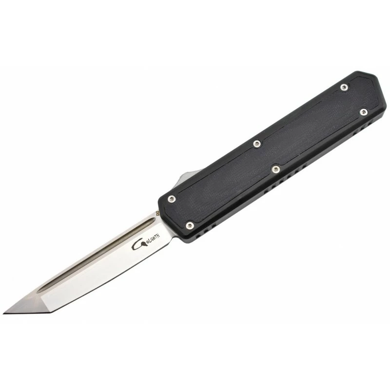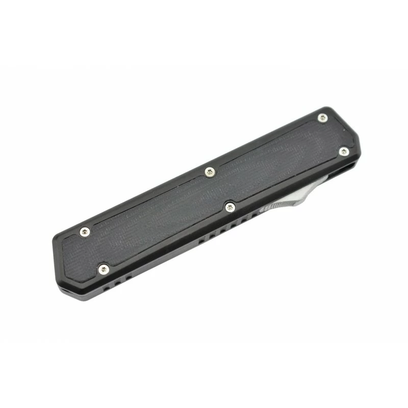Le Golgoth G6 est un couteau automatique OTF muni d’un manche en aluminium anodisé noir (6061-T6), avec insert en G10 du même coloris. Sur le côté de la poignée, on observe la présence d’un bouton poussoir en alliage d’aluminium, qui est à l’origine du déploiement de la lame vers l’avant, de façon automatique. Le manche noir tient parfaitement bien en main, et se transporte aisément grâce à sa longueur de 112mm ainsi que son clip ceinture gris au dos, lui aussi embelli par l’inscription Golgoth. Le G6, un couteau automatique OTF de qualité qui va beaucoup plaire !