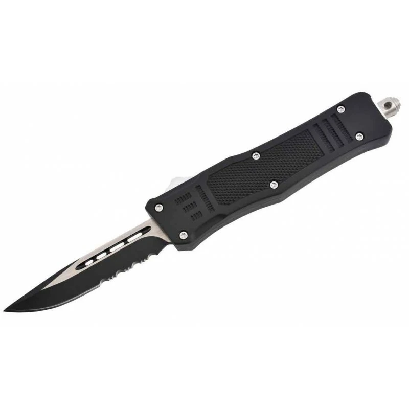 Sur le côté de la poignée, on observe un bouton poussoir, qui tombe parfaitement sous le pouce, et qui éjecte la lame vers l’avant en cas d’utilisation. Une lame mesurant 7cm de long, semi-dentelée, pour une plus grande polyvalence. Fabriquée en acier inoxydable 440C pour une résistance optimale face à la corrosion, la lame est aussi ajourée, et bicolore pour un style plus percutant. Longueur totale du couteau automatique OTF Max Knives MKO3 : 177mm.