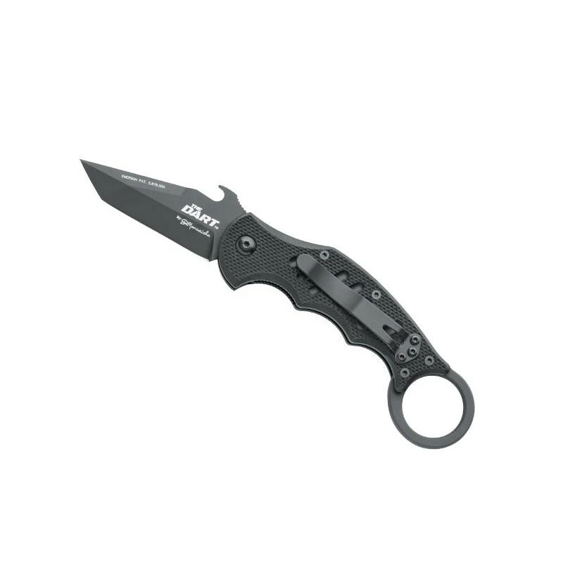 Ce couteau Karambit, minutieusement élaboré par Fox Production, est la version militaire authentique du couteau d’entraînement FX.597TK. Baptisé « The Dart » (« la flèche« ), ce couteau militaire, par son allure féline, autorise des mouvements aussi fulgurants et agiles qu’un tigre ou un aigle. Son design est l’oeuvre de Doug Marcaida, artiste martial américain, d’origine philippine, spécialiste en arts martiaux et couteaux, association que l’on retrouve dans le Pencak-Silat. Il sera très prisé des soldats, forces d’intervention sur le terrain, mais aussi des chasseurs, pêcheurs et randonneurs, pour sa facilité de transport et sa fiabilité absolue. Son acier inoxydable N690Co au niveau de la lame sait supporter les chocs, la chaleur, la froideur, l’eau. Elle sort rapidement, d’une main, à l’aide de son crochet. Puis le verrouillage à cran intérieur (liner-lock) la maintient en position ouverte. Nous sommes en présence d’une lame tanto, c’est-à-dire que la pointe s’inspire du sabre japonais. Le manche G10 résiste à la corrosion. Ses aspérités offrent une tenue en main sûre. L’anneau permet de loger votre index ou un cordon de sécurité et l’épingle se glisse à une poche. Ce couteau de poche pliant sera une arme dissuasive et d’intervention de haute volée, ainsi qu’un outil pratique en activité outdoor. Sa personnalisation par gravure est possible au verso avec un texte bref de votre choix : un nom, un mantra, un pseudonyme.