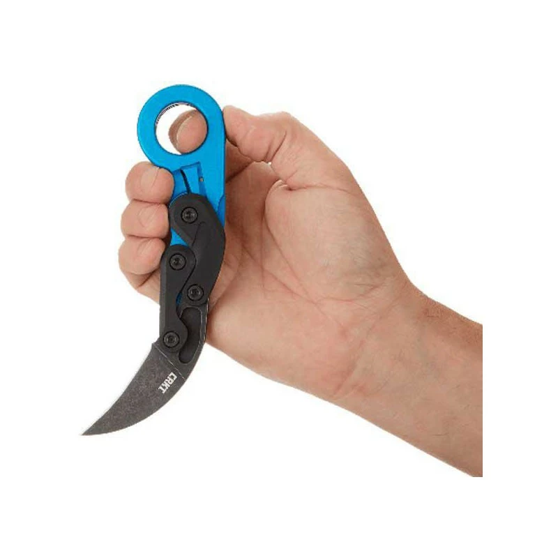 Avec un manche en grivory coloris bleu métallique ne manquant pas d’attirer l’attention, le karambit a une apparence des plus modernes tout en étant à la fois robuste et léger. Son large anneau en bout de poignée, typique du karambit, permet de manier le couteau avec énormément de maîtrise, de contrôle. Moulé par injection, le manche résiste parfaitement aux éventuels chocs du quotidien.