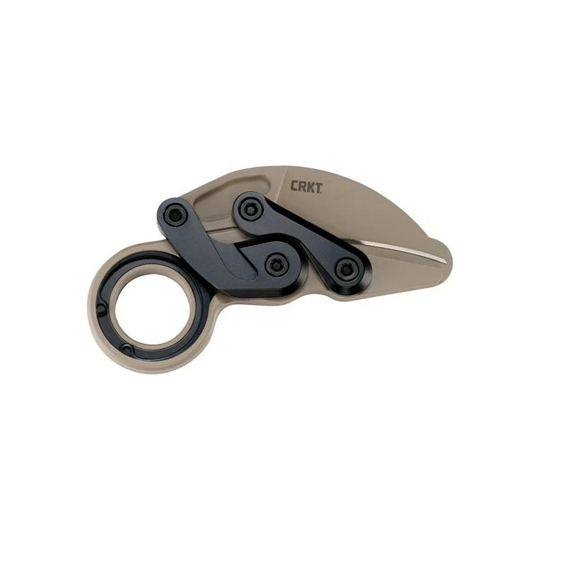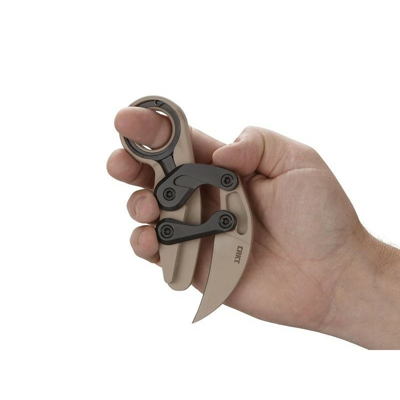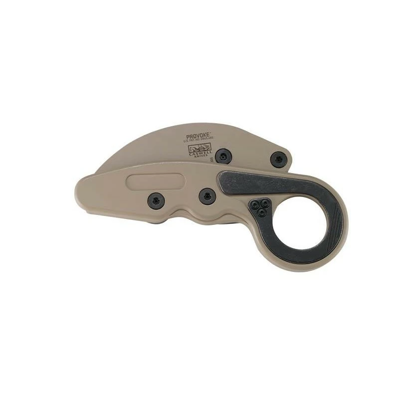 Le CRKT Provoke, modèle 4040DS.CR, dans sa version desert sand. Il comprend un manche en aluminium 6061 avec anneau en bout, le tout d’un joli coloris revĂŞtement cerakote beige avec quelques nuances noires pour le style. Il est bon de mentionner le fait que le manche mesure prĂ©cisĂ©ment 125mm de longueur. Ce karambit de chez Columbia River Knife & Tool, modèle Provoke desert sand, possède Ă©galement une lame hawkbill de 6cm de longueur, en acier D2 rĂ©sistant Ă l’usure et Ă la corrosion. La courte lame, très pointue en bout, est marquĂ©e par l’inscription CRKT en rĂ©fĂ©rence au fabricant, vous avez comme d’habitude la possibilitĂ© d’ajouter une gravure personnalisĂ©e. Le CRKT 4040DS.CR s’ouvre par l’intermĂ©diaire du système d’ouverture Kinematic, il s’utilise facilement et simplement grâce au pouce. Le Provoke existe en d’autres dĂ©clinaisons que le desert sand.