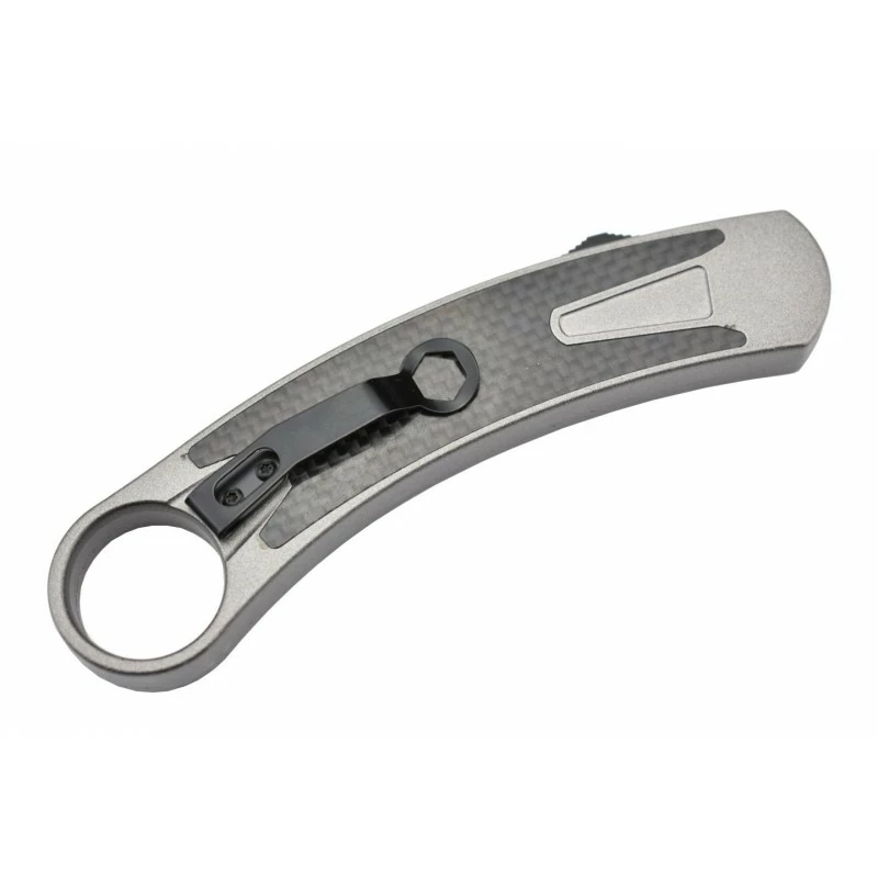 Quant au manche, il est en aluminium argenté et fibre de carbone, un alliage qui manie aussi bien la beauté esthétique que la praticité et la durabilité. Le manche se termine par un anneau pour passage d’une cordelette et dispose d’un clip pour un port à la ceinture.