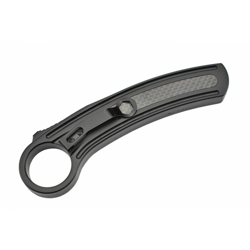 Ce Karambit est quasiment identique au modèle de référence MKO12B1. Il se démarque juste au niveau du manche. S’il est toujours ample, ferme, agile, en aluminium et fibre de carbone, il dispose d’un contour rainuré antidérapant. Dans la main, il se positionne anneau vers le haut ou horizontalement, vers la gauche si vous êtes droitier et inversement. Une tenue en main spécifique au couteau Karambit, fait pour le close combat. Cet anneau de sécurité laisse passer une cordelette ou votre index autour duquel il pivote dans des mouvements rotatifs et véloces. Le manche est également pourvu d’une épingle sur l’une de ses faces pour une fixation à une ceinture.