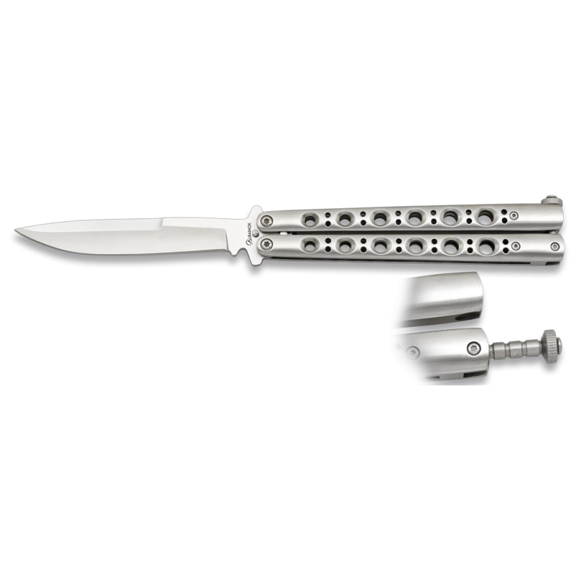 Doté d’un excellent rapport qualité/prix, ce modèle de couteau paipllon possède une lame de 11,2cm en acier inoxydable : elle est marquée par le logo Albainox. Vous avez la possibilité de graver la lame de votre couteau papillon Albainox par le texte de votre choix. Le manche lui est fabriqué en aluminium, il est ajouré par 12 trous (2 x 6 trous) ce qui lui confère une apparence très élégante. L’aluminium est un matériau résistant et ergonomique : il est agréable au toucher et la prise en main est parfaite. À fermeture ajustable, le couteau papillon Albainox 02109 sera parfait pour offrir du fait qu’il est vendu avec sa boîte colorée.