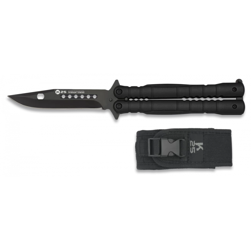 Vous avez aimé le couteau papillon K25 02130 mais aurez préféré que le manche soit d’une couleur plus classique, notamment noir ? Sachez que la marque Espagnole K25 a pensé à vous en concevant un balisong identique en tout point. Mais vous l’aurez compris, à une différence près : la couleur du manche qui sur ce modèle, est noire. D’ailleurs, il faut souligner le fait que la lame de 103mm en acier inoxydable (revêtement titane) est elle aussi entièrement noire ce qui donne du caractère au couteau papillon référence 02131. Une lame tranchante qui se veut très originale en raison de ses multiples décorations géométriques : de petits cercles alignés avec juste au-dessus le logo K25. Le manche en aluminium lui, mesure 127mm de longueur ce qui permet de le transporter facilement n’importe où. Et pour que les déplacements se passent toujours sans encombre, vous pourrez compter en permanence sur un étui noir en nylon lui aussi signé K25.