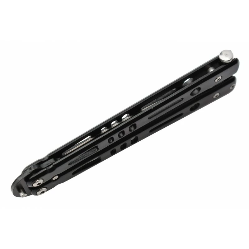 Un bon couteau papillon ne coûte pas obligatoirement excessivement cher. En choisissant le Max Knives P52B, vous optez pour un balisong proposant de belles prestations pour un prix moindre. Comme par exemple un manche en acier inoxydable noir, ajouré avec précision et style : à noter que cela contribue également à la légèreté du couteau. Les « décorations » sont identiques sur les deux parties de la poignée qui mesure 117mm afin de garantir facilité de port et confort de prise en main.