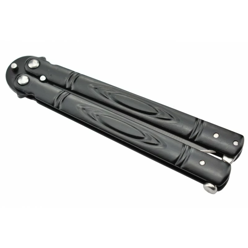 Le couteau papillon Max Knives P55B a un manche en acier noir finement décoré, avec le plus grand soin. La poignée est donc très raffinée et ne manquera pas de vous épater à chaque coup d’œil. En position refermée, le balisong mesure 117mm ce qui assure des manipulations très agréables mais surtout une facilité de transport certaine. Également disponible en version gris silver.