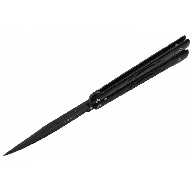 Au vu de son excellent rapport qualité/prix, le Max Knives P55B est idéal pour débuter l’aventure « balisong ». Ce couteau papillon est entièrement conçu en acier inoxydable avec revêtement noir, et résiste ainsi parfaitement à la corrosion/rouille. Fabriquée en acier 3Cr13, la lame est ajourée par six petits trous sur la partie haute, et enrichie du logo Max Knives de couleur claire afin d’attirer le regard. En supplément, il est possible d’ajouter la gravure d’un texte au choix. Longueur de la lame : 98mm.