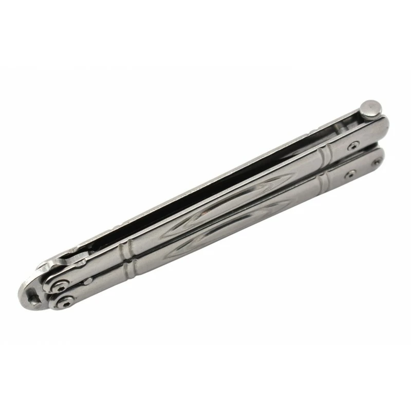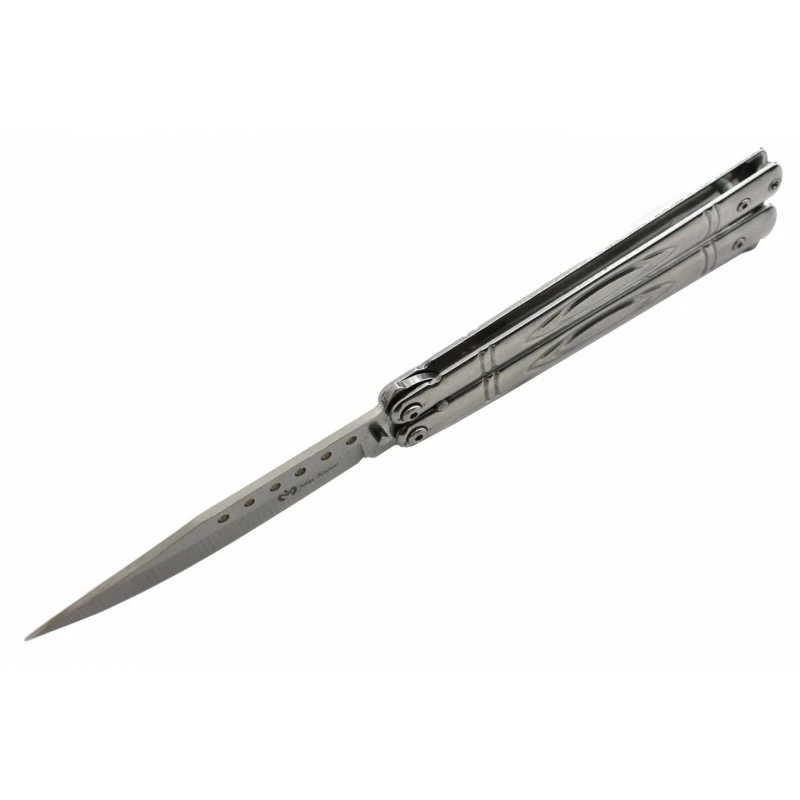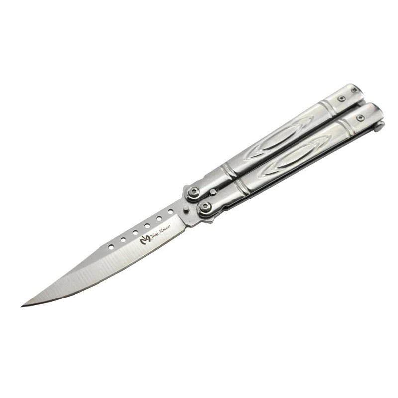 Ce couteau papillon possède une lame de 98mm de longueur en inox 3Cr13, elle est agrémentée de petits trous sur la partie supérieure à l’origine d’un style remarquable. Le logo Max Knives vient parfaire la décoration de la lame, il est d’une couleur plus foncée afin d’attirer l’œil. Le manche du balisong Max Knives P55S mesure 117mm de long afin de bien tenir en main et de se transporter sans encombre. Les deux parties de la poignée sont finement décorées afin d’apporter une note design, raffinée. Existe également en version noire.