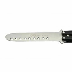 Il est entièrement bleu, c’est le couteau papillon Rainblue muni ici de la référence 02133 ! Ce modèle est caractérisé par un manche en aluminium de forme originale, on peut même apercevoir le logo Rainblue en blanc. Une forme géométrique composée de lignes inclinées pour un effet très déstructuré ! Côté lame, elle est conçue en acier inoxydable et mesure 91mm de longueur. Sa particularité, c’est d’être ajourée par un motif également géométrique pouvant par exemple faire penser à une épée. Fabriqué en Espagne, ce balisong Rainblue 02133 est vendu avec son étui noir en velours (voir photo), parfait pour ne pas abîmer son couteau papillon lors des déplacements et mouvements.