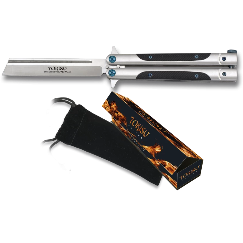 Ce couteau papillon Tokisu 02174 est muni d’une lame droite de longueur 10cm fabriquĂ©e en acier inox 7CR17MoV, un acier Chinois proche du 440A. Ă€ noter que l’on peut apercevoir sur la lame, le logo Tokisu avec juste en-dessous le typer d’acier utilisĂ©. Il est mĂŞme possible de graver la lame par le texte de son choix (voir bouton ci-dessous). Pour information l’Ă©paisseur de lame est de prĂ©cisĂ©ment 3,8mm. CĂ´tĂ© manche, il est fabriquĂ© en acier et G10 pour une Ă©lĂ©gance de tous les instants : un contraste juste sublime ! En plus d’ĂŞtre esthĂ©tique, la poignĂ©e est toujours aussi confortable et transportable (longueur de 135mm) : le couteau papillon Tokisu 02174 pourra se glisser sans problème dans la poche. Conçu en Espagne, ce balisong vous sera livrĂ© avec son Ă©tui de protection en velours noir, très pratique lors des dĂ©placements et mouvements. LivrĂ© en boĂ®te dĂ©corĂ©e avec fermeture magnĂ©tique (cf image du produit).