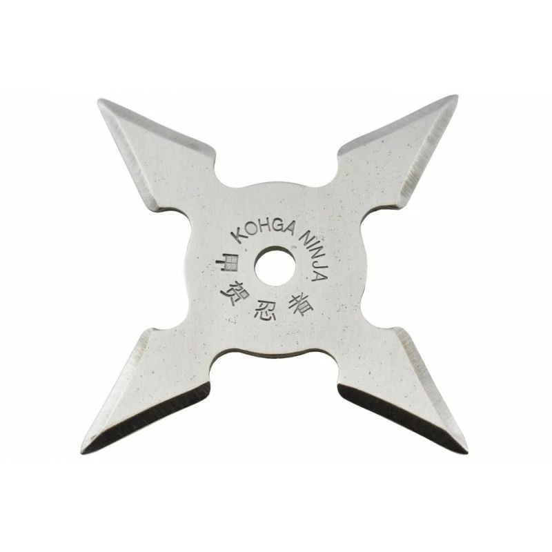 L’arme de jet qui équipe généralement les ninjas pour faire diversion, se doit d’être discrète. La shuriken NS150 couleur argentée l’est complétement, avec un diamètre de 100mm et une épaisseur de 3mm. L’inscription « Kohga ninja » enjolive le centre de l’étoile.
