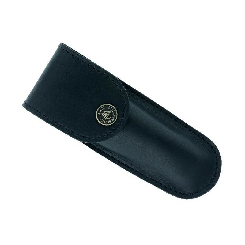 Cet étui S100 en cuir noir est parfait pour ranger son couteau dont le manche mesure 13cm de longueur. Permettant un port horizontal ou vertical, cet étui s’ouvre et se referme à l’aide d’un bouton pression décoré du logo de la marque : Max Capdebarthes.