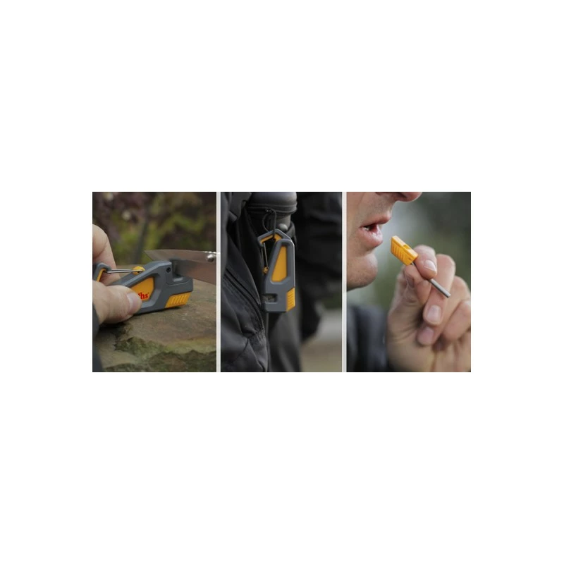 Ultra compact et léger, le Pack Pal Sharpener Smith’s référence 50638 s’emportera facilement n’importe où, notamment durant vos excursions en forêts par exemple. Vous n’aurez aucune difficulté à l’accrocher à votre sac à dos grâce au mousqueton. Il possède une fente d’affûtage en V idéale pour bien entretenir le fil de votre couteau au quotidien. Très complet, le Pack Pal Sharpener Smith’s est un accessoire très utile pour les amateurs de survie en pleine nature : il intègre en plus de l’affûteur manuel un sifflet d’urgence pour alerter en cas de danger. Et ce n’est pas tout, il y a aussi un outil allume-feu qui s’avère très pratique pour allumer un feu facilement et rapidement. Un véritable outil multifonction conçu pour l’Outdoor !