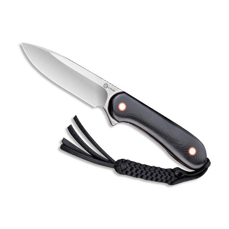 Portant la référence C2104A, ce poignard Civivi Elementum possède un manche en G10 noir avec intercalaires en fibre rouge apportant une petite note colorée. Agréable à tenir dans la main, le manche de 114mm intègre aussi une lanière paracord noire pour les situations urgentes. En plus, cela ne manque pas d’apporter un certain charme ! Nous vous informons que le poignard Civivi Elementum noir/rouge est vendu avec son étui en cuir noir afin de le protéger efficacement, non sans élégance. Côté lame, elle est fabriquée en acier 10Cr15CoMoV à la finition satinée, sa longueur est de 10cm et son épaisseur 3,5mm. Le logo Civivi est présent dans le coin supérieur droit, de façon relativement discrète, la lame est éligible à la personnalisation par procédé gravure. Existe aussi en version tout noir.