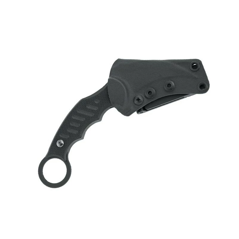 Ce poignard, signé Fox Production, est de type Karambit, un couteau d’Asie du sud-est, destiné au combat rapproché de type martial et sportif. En effet, la lame, très courte de 6cm, fixe, fortement incurvée, et le manche long, mesurant plus de 10 cm, sont propices pour les interventions au corps-à-corps. De ce fait, ce poignard Fox Karambit est destiné aux soldats, militaires, agents d’unités d’élite, mais aussi aux passionnés de ce type d’instruments. La lame est en acier inoxydable N690, un alliage métallique de fer, carbone et chrome insensible à la rouille. Le manche, lui, est en G10, une matière synthétique également peu sensible à l’eau et aux variations de températures. Cet accessoire peut donc s’emporter dans des milieux extrêmes. Vous constaterez sur l’image ci-contre que le manche est doté de sillons et qu’il épouse la forme des doigts pour une préhension sûre. A son extrémité se trouve un anneau servant à faire passer un cordon de sécurité. Sous l’ajour de la lame figure le logo de Fox Production, un renard. Ce couteau de défense est livré avec son étui rigide noir, permettant de le porter au niveau de la ceinture.