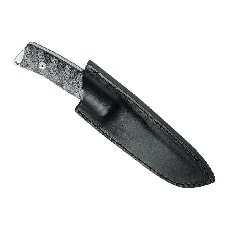 Le manche du poignard est recouvert de plaquettes en micarta noir lui octroyant plus de style ainsi qu’une meilleure préhension. Une excroissance en bout permet de passer aisément un lacet ou cordon, dans le but de tenir ou transporter le couteau plus facilement. D’une longueur totale de 23cm, le poignard est livré avec son étui de transport/rangement.