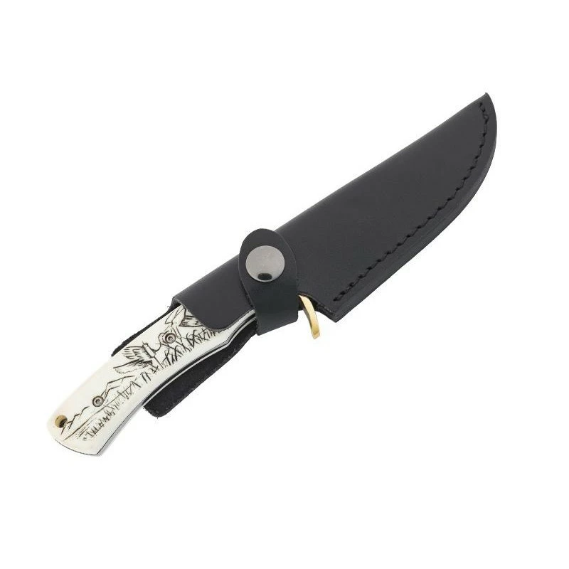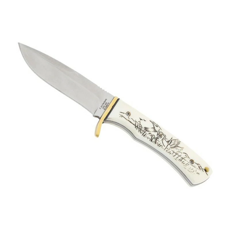 Ce modèle Herbertz 596210 est un poignard de chasse vendu à un tarif attractif. Il est muni d’une poignée faite de matériau plastique imitant l’ivoire, il s’agit d’ivoirine. Ce même manche est décoré d’un motif canard façon scrimshaw, une technique artisanale très prisée des chasseurs dans l’ancien temps. Procurant un grand confort de prise en main, la poignée est aussi à l’origine d’une excellente transportabilité via le trou pour cordon. Le poignard Herbertz possède une lame pleine soie mesurant 10cm de longueur, avec une fabrication en acier inoxydable 420. Une garde de sécurité en laiton doré fait en sorte que la main ne vienne pas glisser pendant l’usage, une sécurité à toute épreuve. Ce couteau de chasse à lame fixe est livré avec son étui en cuir noir dont la fermeture se réalise par bouton pression. Existe aussi avec décoration cerf.
