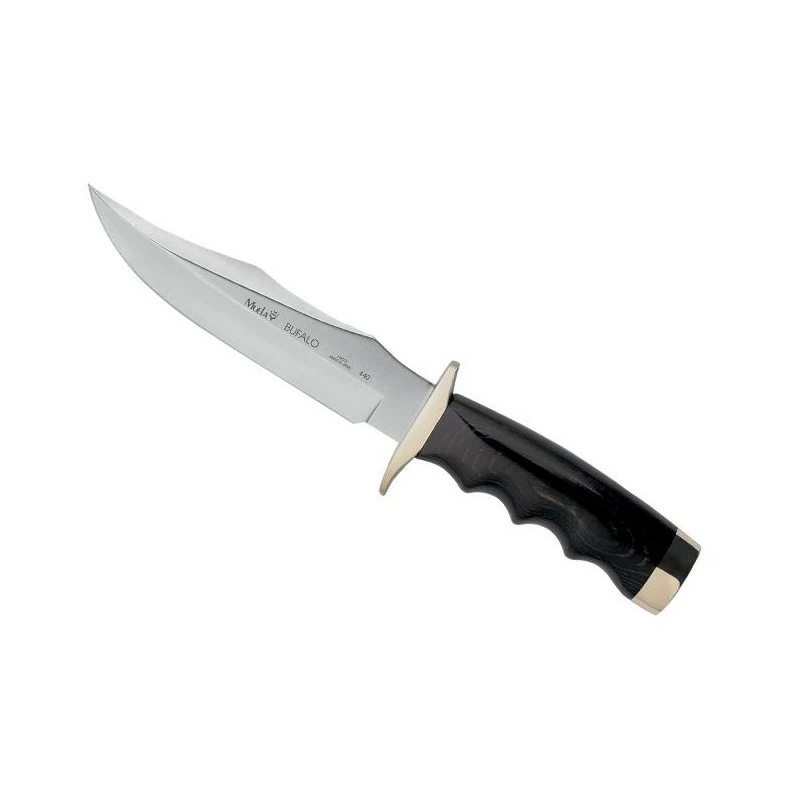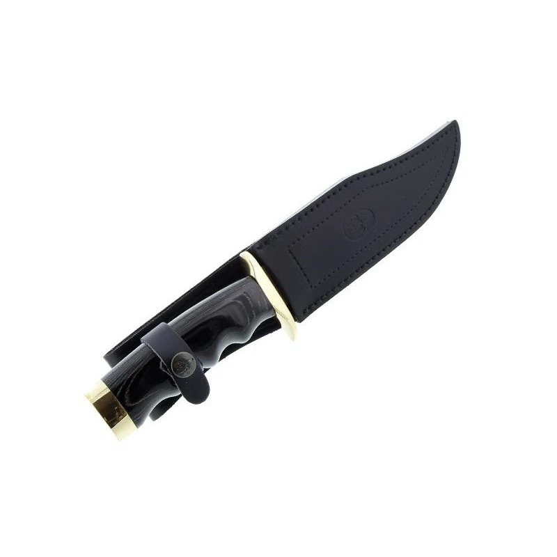 Voici la version « manche en micarta noir » du poignard Muela Bufalo. Une couleur plus classique qui séduira un plus grand nombre d’amateurs. Le manche du Muela Bufalo est très esthétique en raison de son coloris noir (micarta) mais aussi doré sur les extrémités (dont la garde de sécurité limitant les risques de blessures), monture maillechort. Avec un design discret mais élégant, le manche est aussi très ergonomique en offrant au chasseur ou aventurier une prise en main des plus confortables. Ce poignard Muela Bufalo 9257, c’est aussi une lame de longueur 17cm en acier inoxydable avec pointe orientée vers le haut. À la fois tranchante et résistante (notamment face à la corrosion ou rouille), la lame de 17cm est marquée par le nom du poignard, à savoir le Muela Bufalo. Transporter et prendre soin du poignard sera très facile grâce à la présence d’un étui en cuir de grande qualité (voir les autres images du produit).